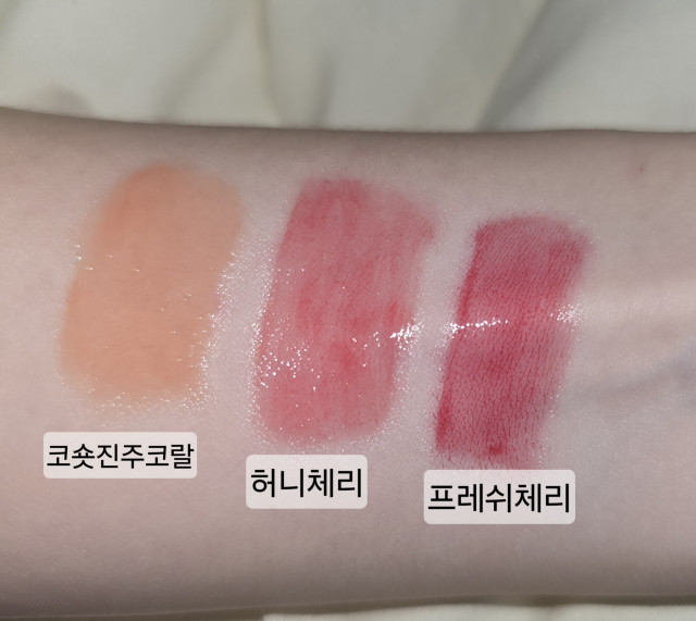 프레쉬체리는 확실한 청량감이 있는 포인트립이지만 허니체리는 정말 꿀 섞은 것처럼 웜한 색감이에요. 그렇다고 코숏진주코랄처럼 흰기있는 느낌은 아니에요!