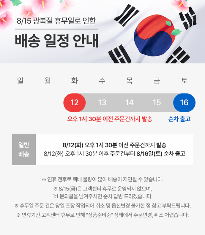 - 8/12(화) 오후 1시 30분 이후 주문건부터 8/16(토) 순차 출고