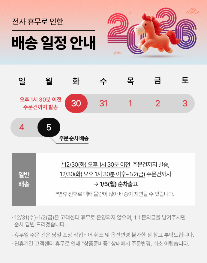 - 12/30(화) 오후 1시 30분 이후~ 1/2(금) 주문 건까지 -> 1/5(월) 순차발송