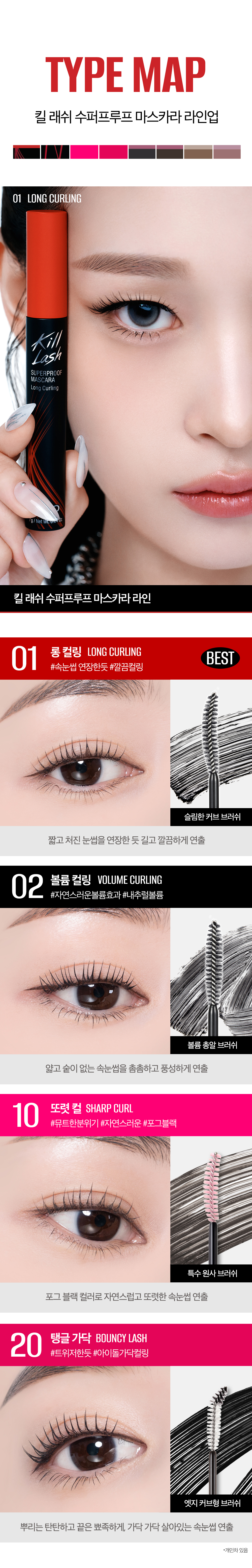 | [파인 1호] 아이소도데케인, 트라이메틸실록시실리케이트, 탤크, 마이크로크리스탈린왁스, 세레신, 다이스테아다이모늄헥토라이트, 덱스트린팔미테이트, 폴리아이소부텐, 흑색산화철 (CI 77499), 합성왁스, 프로필렌카보네이트, 폴리프로필실세스퀴옥세인, 실리카, 셀룰로오스, 글리세릴카프릴레이트, 트라이에톡시카프릴릴실레인 [파인 2호] 아이소도데케인, 트라이메틸실록시실리케이트, 탤크, 마이크로크리스탈린왁스, 세레신, 다이스테아다이모늄헥토라이트, 덱스트린팔미테이트, 폴리아이소부텐, 흑색산화철 (CI 77499), 합성왁스, 프로필렌카보네이트, 폴리프로필실세스퀴옥세인, 실리카, 적색산화철 (CI 77491), 셀룰로오스, 글리세릴카프릴레이트, 트라이에톡시카프릴릴실레인 [파인 3호] 아이소도데케인,트라이메틸실록시실리케이트,탤크,마이크로크리스탈린왁스,세레신,덱스트린팔미테이트,다이스테아다이모늄헥토라이트,폴리아이소부텐,합성왁스,흑색산화철 (CI 77499),프로필렌카보네이트,폴리프로필실세스퀴옥세인,실리카,셀룰로오스,글리세릴카프릴레이트,트라이에톡시카프릴릴실레인,티타늄디옥사이드 (CI 77891),적색산화철 (CI 77491),황색산화철 (CI 77492) [파인 4호] 아이소도데케인,트라이메틸실록시실리케이트,탤크,마이크로크리스탈린왁스,세레신,덱스트린팔미테이트,다이스테아다이모늄헥토라이트,폴리아이소부텐,합성왁스,프로필렌카보네이트,폴리프로필실세스퀴옥세인,실리카,마이카,셀룰로오스,글리세릴카프릴레이트,트라이에톡시카프릴릴실레인,적색산화철 (CI 77491),흑색산화철 (CI 77499),티타늄디옥사이드 (CI 77891) 1호 롱컬링 아이소도데케인,트리메칠실록시실리케이트,탤크,세레신,덱스트린팔미테이트,마이크로크리스탈린왁스,디스테아디모늄헥토라이트,흑색산화철 (CI 77499),폴리프로필실세스퀴옥산,프로필렌카보네이트,실리카,칸디다봄비콜라/글루코오스/메칠레이프씨데이트발효물,아르간트리커넬오일,녹차씨오일,올리브오일,하이드롤라이즈드콜라겐,락토바실러스/콩추출물발효여과물,덱스트린팔미테이트/에칠헥사노에이트,하이드로제네이티드폴리이소부텐,나일론-66,트리에톡시카프릴릴실란,글리세릴카프릴레이트,정제수,디프로필렌글라이콜,1,2-헥산디올,티타늄디옥사이드 (CI 77891) 2호 볼륨컬링 아이소도데케인,트리메칠실록시실리케이트,탤크,세레신,덱스트린팔미테이트/에칠헥사노에이트,디스테아디모늄헥토라이트,마이크로크리스탈린왁스,흑색산화철 (CI 77499),폴리프로필실세스퀴옥산,프로필렌카보네이트,칸디다봄비콜라/글루코오스/메칠레이프씨데이트발효물,아르간트리커넬오일,녹차씨오일,올리브오일,하이드롤라이즈드콜라겐,락토바실러스/콩추출물발효여과물,하이드로제네이티드폴리이소부텐,실리카실릴레이트,알루미늄디스테아레이트,폴리메칠실세스퀴옥산,트리에톡시카프릴릴실란,글리세릴카프릴레이트,실리카,정제수,디프로필렌글라이콜,1,2-헥산디올 아이소도데케인, 다이스테아다이모늄헥토라이트, 덱스트린팔미테이트, 트라이메틸실록시실리케이트, 마이크로크리스탈린왁스, 세레신, 흑색산화철 (CI 77499), 하이드로제네이티드폴리아이소부텐, 폴리프로필실세스퀴옥세인, 덱스트린팔미테이트/에틸헥사노에이트, 프로필렌카보네이트, 파라핀, 실리카, 실리카실릴레이트, 레이온, 글리세릴카프릴레이트, 에틸렌/프로필렌코폴리머, 트라이에톡시카프릴릴실레인, 정제수, 판테놀, 비에이치티, 페녹시에탄올, 카본블랙 (CI 77266) 10호 또렷컬 아이소도데케인,트라이메틸실록시실리케이트,세레신,폴리아이소부텐,탤크,덱스트린팔미테이트/에틸헥사노에이트,다이스테아다이모늄헥토라이트,마이크로크리스탈린왁스,흑색산화철 (CI 77499),실리카,프로필렌카보네이트,하이드로제네이티드폴리아이소부텐,폴리프로필실세스퀴옥세인,셀룰로오스,글리세릴카프릴레이트,트라이에톡시카프릴릴실레인,폴리메틸실세스퀴옥세인,티타늄디옥사이드 (CI 77891),황색산화철 (CI 77492),적색산화철 (CI 77491) 20호 탱글가닥 아이소도데케인,트라이메틸실록시실리케이트,칼슘카보네이트,마이크로크리스탈린왁스,흑색산화철,다이스테아다이모늄헥토라이트,세레신,덱스트린팔미테이트/에틸헥사노에이트,하이드로제네이티드폴리아이소부텐,합성왁스,셀룰로오스,덱스트린팔미테이트,프로필렌카보네이트,폴리프로필실세스퀴옥세인,다이칼슘포스페이트,트라이에톡시카프릴릴실레인,글리세릴카프릴레이트 |