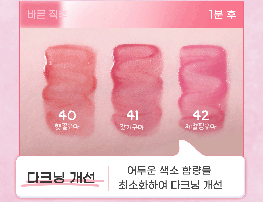 | 002 정제수,다이페닐다이메티콘,다이아이소스테아릴말레이트,비스-다이글리세릴폴리아실아디페이트-2,하이드로제네이티드폴리아이소부텐,비스-베헤닐/아이소스테아릴/피토스체릴다이머다이리놀레일다이머다이리놀리에이트,다이글리세린,세틸피이지/피피지-10/1다이메티콘,다이프로필렌글라이콜,하이드로제네이티드폴리(C6-14올레핀),폴리솔베이트60,솔비탄아이소스테아레이트,다이아이소스테아로일폴리글리세릴-3다이머다이리놀리에이트,펜틸렌글라이콜,하이드록시에틸아크릴레이트/소듐아크릴로일다이메틸타우레이트코폴리머,카프릴릭/카프릭트라이글리세라이드,스쿠알란,세테아레스-20,에틸렌/프로필렌코폴리머,페녹시에탄올,글리세린,티타늄디옥사이드,황색5호,폴리글리세린-3,향료,에틸헥실글리세린,적색227호,적색104호의(1),청색1호,버지니아풍년화잎추출물,참나리추출물,부틸렌글라이콜 003 정제수,다이페닐다이메티콘,다이아이소스테아릴말레이트,비스-다이글리세릴폴리아실아디페이트-2,하이드로제네이티드폴리아이소부텐,비스-베헤닐/아이소스테아릴/피토스테릴다이머다이리놀레일다이머다이리놀리에이트,다이글리세린,다이프로필렌글라이콜,세틸피이지/피피지-10/1다이메티콘,하이드로제네이티드폴리데센,폴리솔베이트60,솔비탄아이소스테아레이트,다이아이소스테아로일폴리글리세릴-3다이머다이리놀리에이트,펜틸렌글라이콜,하이드록시에틸아크릴레이트/소듐아크릴로일다이메틸타우레이트코폴리머,카프릴릭/카프릭트라이글리세라이드,스쿠알란,세테아레스-20,에틸렌/프로필렌코폴리머,페녹시에탄올,티타늄디옥사이드,글리세린,황색5호,향료,에틸헥실글리세린,적색104호의(1),적색227호,청색1호,버지니아풍년화잎추출물,참나리추출물,부틸렌글라이콜,펜타에리스리틸테트라-다이-t-부틸하이드록시하이드로신나메이트 005 정제수,다이페닐다이메티콘,다이아이소스테아릴말레이트,비스-다이글리세릴폴리아실아디페이트-2,하이드로제네이티드폴리아이소부텐,비스-베헤닐/아이소스테아릴/피토스체릴다이머다이리놀레일다이머다이리놀리에이트,다이글리세린,세틸피이지/피피지-10/1다이메티콘,다이프로필렌글라이콜,하이드로제네이티드폴리(C6-14올레핀),폴리솔베이트60,솔비탄아이소스테아레이트,다이아이소스테아로일폴리글리세릴-3다이머다이리놀리에이트,펜틸렌글라이콜,하이드록시에틸아크릴레이트/소듐아크릴로일다이메틸타우레이트코폴리머,카프릴릭/카프릭트라이글리세라이드,스쿠알란,세테아레스-20,에틸렌/프로필렌코폴리머,페녹시에탄올,폴리글리세린-3,적색227호,향료,에틸헥실글리세린,황색4호,적색104호의(1),글리세린,황색5호,청색1호,버지니아풍년화잎추출물,참나리추출물,부틸렌글라이콜 013 정제수,다이페닐다이메티콘,다이아이소스테아릴말레이트,비스-다이글리세릴폴리아실아디페이트-2,하이드로제네이티드폴리아이소부텐,비스-베헤닐/아이소스테아릴/피토스테릴다이머다이리놀레일다이머다이리놀리에이트,다이글리세린,다이프로필렌글라이콜,펜틸렌글라이콜,세틸피이지/피피지-10/1다이메티콘,하이드로제네이티드폴리데센,폴리솔베이트60,솔비탄아이소스테아레이트,다이아이소스테아로일폴리글리세릴-3다이머다이리놀리에이트,1,2-헥산다이올,하이드록시에틸아크릴레이트/소듐아크릴로일다이메틸타우레이트코폴리머,카프릴릭/카프릭트라이글리세라이드,스쿠알란,페녹시에탄올,세테아레스-20,티타늄디옥사이드,에틸렌/프로필렌코폴리머,적색227호,향료,황색5호,황색4호,알루미늄하이드록사이드,암모늄폴리아크릴레이트,적색104호의(1),부틸렌글라이콜,청색1호,버지니아풍년화잎추출물,참나리추출물,펜타에리스리틸테트라-다이-t-부틸하이드록시하이드로신나메이트 018 정제수,다이페닐다이메티콘,다이아이소스테아릴말레이트,비스-다이글리세릴폴리아실아디페이트-2,하이드로제네이티드폴리아이소부텐,비스-베헤닐/아이소스테아릴/피토스테릴다이머다이리놀레일다이머다이리놀리에이트,다이글리세린,다이프로필렌글라이콜,세틸피이지/피피지-10/1다이메티콘,하이드로제네이티드폴리데센,폴리솔베이트60,솔비탄아이소스테아레이트,다이아이소스테아로일폴리글리세릴-3다이머다이리놀리에이트,펜틸렌글라이콜,하이드록시에틸아크릴레이트/소듐아크릴로일다이메틸타우레이트코폴리머,카프릴릭/카프릭트라이글리세라이드,스쿠알란,티타늄디옥사이드,세테아레스-20,에틸렌/프로필렌코폴리머,페녹시에탄올,황색5호,향료,에틸헥실글리세린,적색227호,황색4호,알루미늄하이드록사이드,암모늄폴리아크릴레이트,부틸렌글라이콜,청색1호,적색104호의(1),버지니아풍년화잎추출물,참나리추출물,펜타에리스리틸테트라-다이-t-부틸하이드록시하이드로신나메이트 020 정제수,다이페닐다이메티콘,다이아이소스테아릴말레이트,비스-다이글리세릴폴리아실아디페이트-2,하이드로제네이티드폴리아이소부텐,비스-베헤닐/아이소스테아릴/피토스테릴다이머다이리놀레일다이머다이리놀리에이트,다이글리세린,다이프로필렌글라이콜,세틸피이지/피