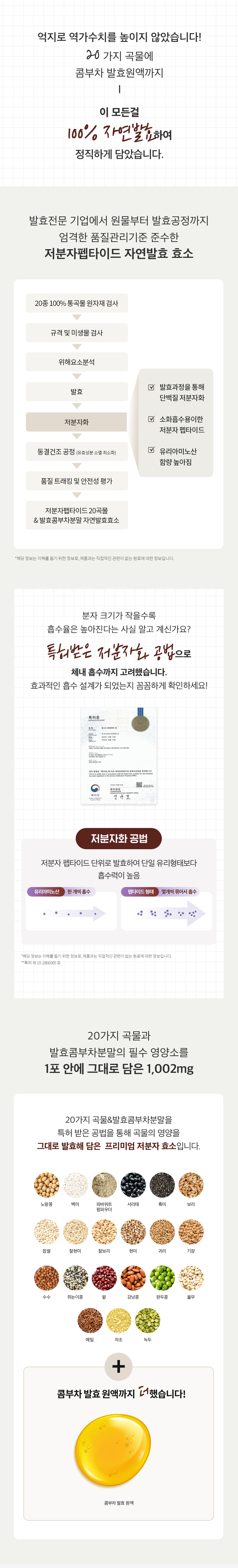 | 20곡곡물발효효소분말[노란콩(국내산), 백미(국내산), 발효콤부차분말(콤부차발효액, 말토덱스트린), 파바위트펌파우더, 검정콩, 보리, 흑미, 찰보리, 찰현미, 찹쌀, 귀리, 현미, 기장, 수수, 쥐눈이콩, 강낭콩, 완두, 팥, 녹두, 메밀, 차조, 율무, Bacillus subtilis], 프락토올리고당(이스라엘산), 고구마농축분말[고구마농축액(고구마: 국내산), 덱스트린], 분리대두단백(분리대두단백, 레시틴), 이소말트, 대나무수액추출분말, 효소처리스테비아, 양배추농축분말, 파인애플추출분말, 단호박농축분말, 차전자피식이섬유, 귀리식이섬유, 아미노산혼합분말, 유산균혼합분말, 매실농축분말, 녹차분말 |