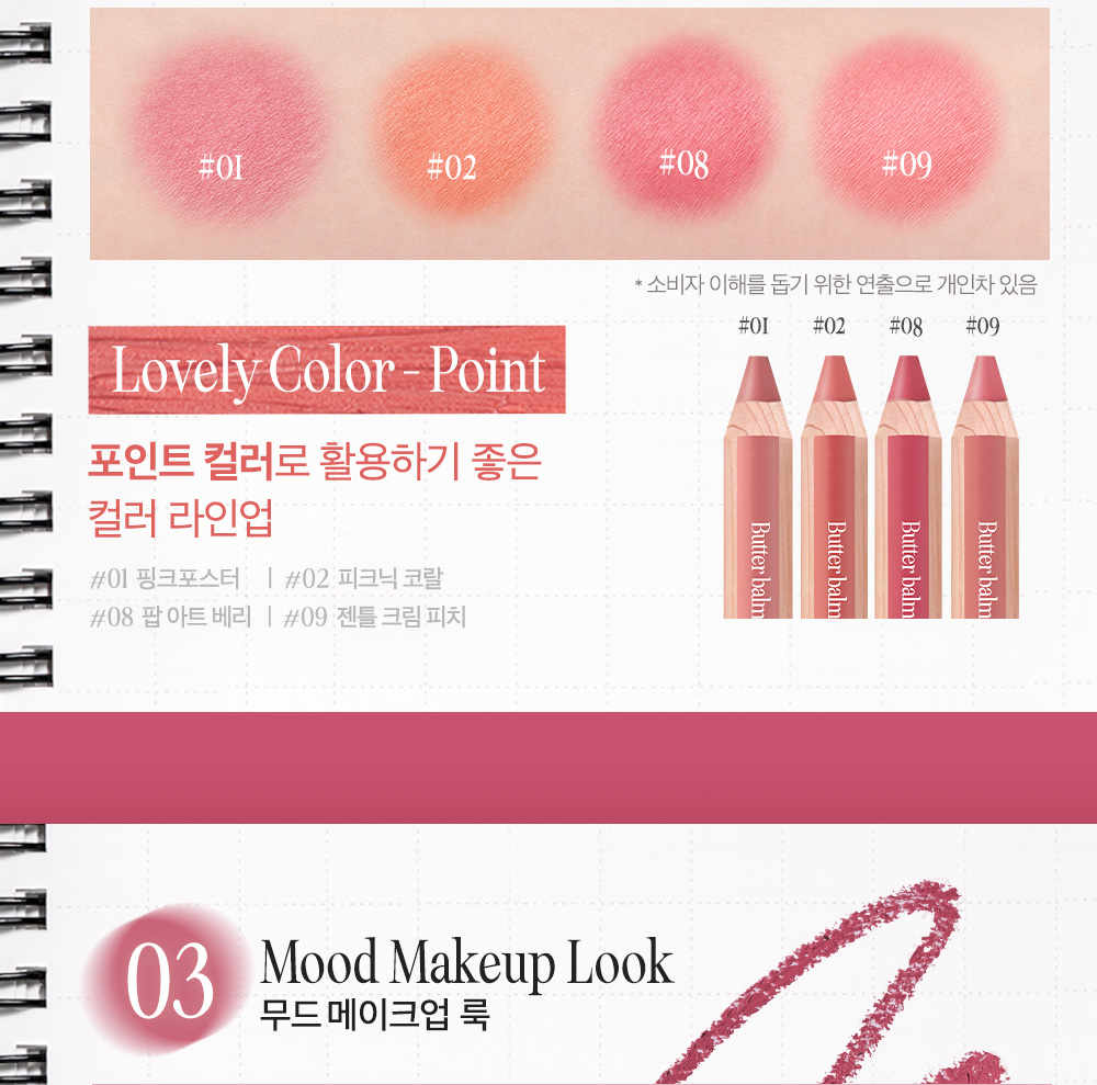 | 1호 피마자씨오일,카프릴릭/카프릭트라이글리세라이드, 글리세릴리시놀리에이트,칸데릴라왁스,합성비즈왁스, 미리스틸미리스테이트,티타늄디옥사이드 (CI 77891), 카나우바왁스, 세틸알코올,미리스틸락테이트,적색산화철 (CI 77491),황색산화철 (CI 77492),흑색산화철 (CI 77499),마이카 (CI 77019),탈크,적색202호,향료,토코페롤,적색202호,시어버터,아스코빌팔미테이트 2호 피마자씨오일,카프릴릭/카프릭트라이글리세라이드, 글리세릴리시놀리에이트,칸데릴라왁스,합성비즈왁스, 미리스틸미리스테이트, 카나우바왁스,티타늄디옥사이드 (CI 77891), 세틸알코올,미리스틸락테이트,마이카 (CI 77019),탈크,적색산화철 (CI 77491),황색산화철 (CI 77492),흑색산화철 (CI 77499),황색4호,향료,적색201호,토코페롤,적색202호,시어버터아스코빌팔미테이트 3호 피자마씨오일,카프릴릭/카프릭트라이글리세라이드, 글리세릴리시놀리에이트,칸데릴라왁스,티타늄디옥사이드 (CI 77891),합성비즈왁스, 미리스틸미리스테이트, 카나우바왁스,적색산화철 (CI 77491),황색산화철 (CI 77492),흑색산화철 (CI 77499), 세틸알코올,마이카 (CI 77019),미리스틸락테이트,탈크,적색202호,향료,토코페롤,시어버터,아스코빌팔미테이트 4호 피자마씨오일,카프릴릭/카프릭트라이글리세라이드, 글리세릴리시놀리에이트,칸데릴라왁스,합성비즈왁스, 미리스틸미리스테이트, 카나우바왁스,티타늄디옥사이드 (CI 77891), 세틸알코올,마이카 (CI 77019),미리스틸락테이트,탈크,적색산화철 (CI 77491),황색산화철 (CI 77492),흑색산화철 (CI 77499),향료,토코페롤,적색201호,적색202호,황색4호,시어버터아스코빌팔미테이트 5호 피자마씨오일,카프릴릭/카프릭트라이글리세라이드, 글리세릴리시놀리에이트,칸데릴라왁스,티타늄디옥사이드 (CI 77891),합성비즈왁스, 미리스틸미리스테이트, 카나우바왁스, 세틸알코올,적색산화철 (CI 77491),황색산화철 (CI 77492),흑색산화철 (CI 77499),미리스틸락테이트,마이카 (CI 77019),탈크,적색202호,향료,토코페롤,시어버터,아스코빌팔미테이트 6호 피자마씨오일,카프릴릭/카프릭트라이글리세라이드, 글리세릴리시놀리에이트,칸데릴라왁스,티타늄디옥사이드 (CI 77891),합성비즈왁스, 미리스틸미리스테이트, 카나우바왁스,적색산화철 (CI 77491),황색산화철 (CI 77492),흑색산화철 (CI 77499), 세틸알코올,미리스틸락테이트,적색202호,마이카 (CI 77019),탈크,황색4호,향료,토코페롤,적색104호의(1),적색201호,시어버터,아스코빌팔미테이트 7호 피자마씨오일,카프릴릭/카프릭트라이글리세라이드, 글리세릴리시놀리에이트,칸데릴라왁스,합성비즈왁스, 미리스틸미리스테이트, 카나우바왁스,티타늄디옥사이드 (CI 77891), 세틸알코올,미리스틸락테이트,마이카 (CI 77019),탈크,적색202호,적색산화철 (CI 77491),황색산화철 (CI 77492),흑색산화철 (CI 77499),황색4호,향료,토코페롤,시어버터,아스코빌팔미테이트 8호 피자마씨오일,카프릴릭/카프릭트라이글리세라이드, 글리세릴리시놀리에이트,칸데릴라왁스,합성비즈왁스, 미리스틸미리스테이트, 카나우바왁스,티타늄디옥사이드 (CI 77891), 세틸알코올,미리스틸락테이트,적색226호,망가니즈 바이올렛 (CI 77742),마이카 (CI 77019),탈크,향료,토코페롤,적색산화철 (CI 77491),황색산화철 (CI 77492),흑색산화철 (CI 77499),시어버터,아스코빌팔미테이트 9호 피자마씨오일,카프릴릭/카프릭트라이글리세라이드,티타늄디옥사이드 (CI 77891), 글리세릴리시놀리에이트,칸데릴라왁스,합성비즈왁스, 미리스틸미리스테이트, 카나우바왁스, 세틸알코올,적색산화철 (CI 77491),황색산화철 (CI 77492),흑색산화철 (CI 77499),미리스틸락테이트,적색201호,적색202호,마이카 (CI 77019),탈크,향료,토코페롤,시어버터,아스코빌팔미테이트 10호 피자마씨오일,카프릴릭/카프릭트라이글리세라이드, 글리세릴리시놀리에이트,칸데릴라왁스,티타늄디옥사이드 (CI 77891),합성비즈왁스, 미리스틸미리스테이트,적색산화철 (CI 77491),황색산화철 (CI 77492),흑색산화철 (CI 77499), 카나우바왁스, 세틸알코올,미리스틸락테이트,적색202호,향료,토코페롤,마이카 (CI 77019),시어버터,탈크,아스코빌팔미테이트 11호 피마자씨오일, 글리세릴리시놀리에이트,카프릴릭/카프릭트라이글리세라이드,칸데릴라왁스,티타늄디옥사이드 (CI 77891), 비즈왁스, 미리스틸미리스테이트, 카나우바왁스, 세틸알코올,미리스틸락테이트,황색4호레이크,탈크,적색산화철 (CI 77491),황색산화철 (CI 77492),흑색산화철 (CI 77499),적색201호,향료,적색202호,토코페롤,시어버터,아스코빌팔미테이트 12호 피마자씨오일, 글리세릴리시놀리에이트,카프릴릭/카프릭트라이글리세라이드,칸데릴라왁스,티타늄디옥사이드 (CI 77891), 비즈왁스, 미리스틸미리스테이트, 카나우바왁스,적색201호, 세틸알코올,적색산화철 (CI 77491),황색산화철 (CI 77492),흑색산화철 (CI 77499),미리스틸락테이트,탈크,향료,망가니즈 바이올렛 (CI 77742),적색202호,토코페롤,시어버터,아스코빌팔미테이트 13호 피자마씨오일, 글리세릴리시놀리에이트,카프릴릭/카프릭트라이글리세라이드,칸데릴라왁스, 비즈왁스, 미리스틸미리스테이트, 카나우바왁스,적색104호의(1), 세틸알코올,티타늄디옥사이드 (CI 77891),미리스틸