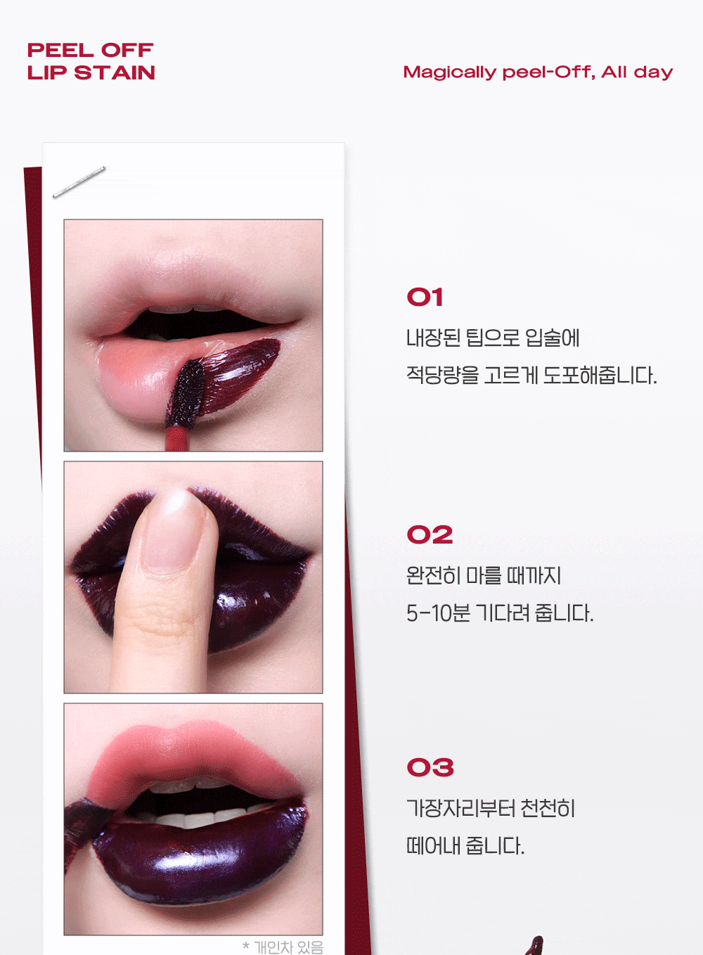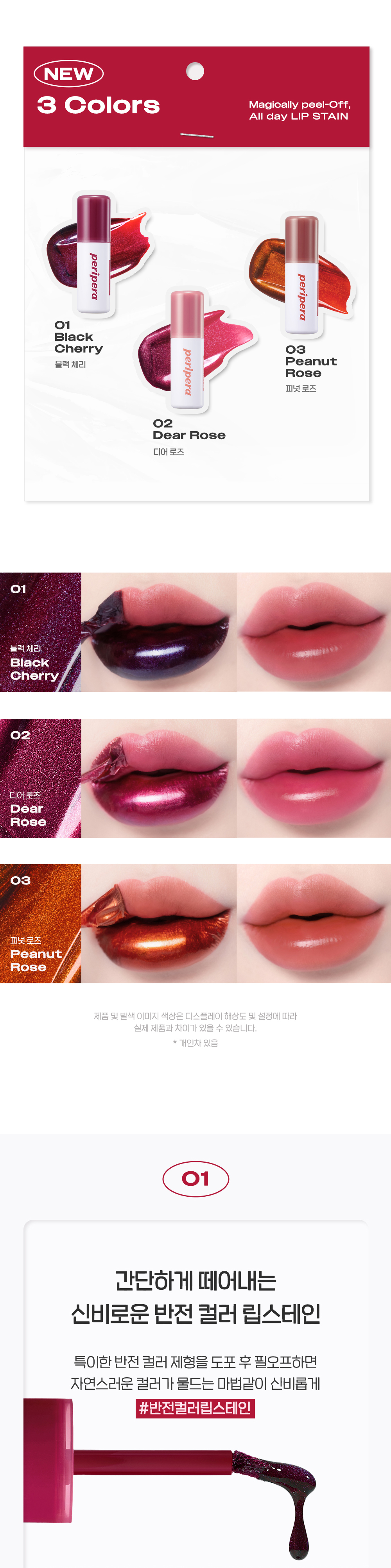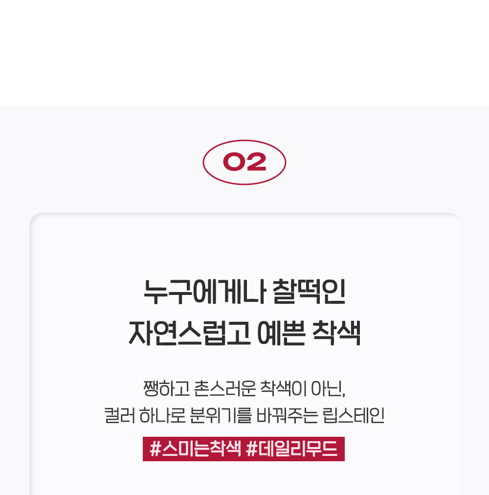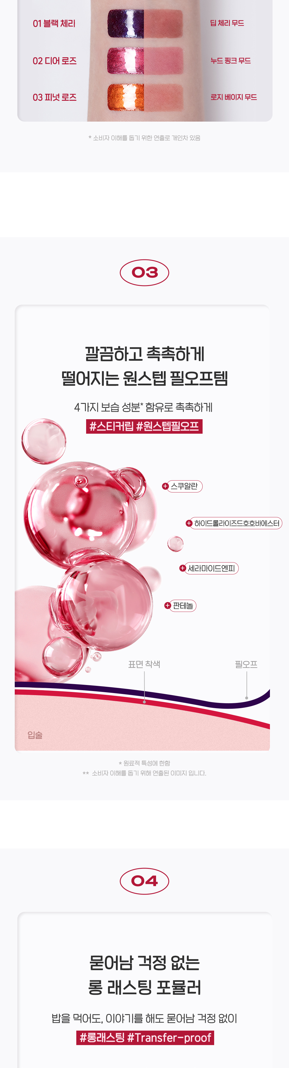 | 01 정제수, 폴리비닐알코올, 다이프로필렌글라이콜, 변성알코올, 티타늄디옥사이드 (CI 77891), 마이카, 펜틸렌글라이콜, 페녹시에탄올, 황색5호 (CI 15985), 적색227호 (CI 17200), 피이지-60하이드로제네이티드캐스터오일, 황색4호 (CI 19140), 향료, 적색104호의(1) (CI 45410), 소듐아크릴레이트크로스폴리머-2, 에틸헥실글리세린, 틴옥사이드, 청색1호 (CI 42090), 세라마이드엔피, 스쿠알란, 판테놀, 하이드롤라이즈드호호바에스터 02 정제수, 폴리비닐알코올, 마이카, 다이프로필렌글라이콜, 변성알코올, 펜틸렌글라이콜, 티타늄디옥사이드 (CI 77891), 페녹시에탄올, 적색227호 (CI 17200), 피이지-60하이드로제네이티드캐스터오일, 황색4호 (CI 19140), 향료, 황색5호 (CI 15985), 소듐아크릴레이트크로스폴리머-2, 에틸헥실글리세린, 적색104호의(1) (CI 45410), 청색1호 (CI 42090), 세라마이드엔피, 스쿠알란, 판테놀, 하이드롤라이즈드호호바에스터 03 정제수, 폴리비닐알코올, 마이카 (CI 77019), 다이프로필렌글라이콜, 변성알코올, 티타늄디옥사이드 (CI 77891), 펜틸렌글라이콜, 페녹시에탄올, 황색4호 (CI 19140), 황색5호 (CI 15985), 피이지-60하이드로제네이티드캐스터오일, 적색104호의(1) (CI 45410), 향료, 소듐아크릴레이트크로스폴리머-2, 적색227호 (CI 17200), 에틸헥실글리세린, 틴옥사이드, 청색1호 (CI 42090), 세라마이드엔피, 스쿠알란, 판테놀, 하이드롤라이즈드호호바에스터 |