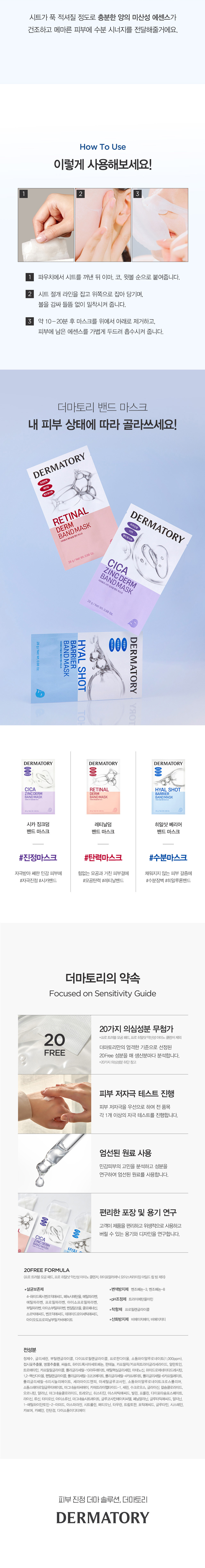 | 로션: 정제수, 글리세린, 부틸렌글라이콜, 세틸에틸헥사노에이트, 글리세레스-26, 1,2-헥산다이올, 폴리글리세린-3, 시어버터, 카보머, 세테아릴올리베이트, 트로메타민, 솔비탄올리베이트, 폴리아크릴레이트-13, 스쿠알란, 에틸헥실글리세린, C30-45알킬세테아릴다이메티콘크로스폴리머, 알란토인, 글리세릴아크릴레이트/아크릴릭애씨드코폴리머, 하이드로제네이티드폴리아이소부텐, 아데노신, 소듐폴리아크릴레이트, 판테놀 (100ppm), 솔비탄아이소스테아레이트, 글루코오스, 소듐하이알루로네이트 (5ppm), 하이알루로닉애씨드 (2ppm), 비닐다이메티콘, 다이소듐이디티에이, 카프릴릴메티콘, 폴리글리세릴-10라우레이트, 에틸헥실팔미테이트, 하이드롤라이즈드소듐하이알루로네이트 (1.1ppm), 소듐하이알루로네이트크로스폴리머 (1ppm), 하이드롤라이즈드하이알루로닉애씨드 (1ppm), 소듐아세틸레이티드하이알루로네이트 (0.1ppm), 하이드록시프로필트라이모늄하이알루로네이트 (0.1ppm), 카페인, 드럼스틱씨오일, 락토바실러스발효물, 세라마이드엔피, 피토스핑고신, 하이드로제네이티드레시틴, 향료 밴드마스크 정제수, 글리세린, 부틸렌글라이콜, 다이프로필렌글라이콜, 프로판다이올, 소듐하이알루로네이트(1,000ppm), 접시꽃추출물, 병풀추출물, 씨솔트, 하이드록시아세토페논, 판테놀, 카프릴릭/카프릭트라이글리세라이드, 알란토인, 트로메타민, 카프릴릴글라이콜, 폴리글리세릴-10라우레이트, 에틸헥실글리세린, 아데노신, 하이드로제네이티드레시틴, 1,2-헥산다이올, 펜틸렌글라이콜, 폴리글리세릴-3코코에이트, 폴리글리세릴-4카프레이트, 폴리글리세릴-6카프릴레이트, 폴리글리세릴-6리시놀리에이트, 세라마이드엔피, 아세틸글루코사민, 소듐하이알루로네이트크로스폴리머, 소듐스테아로일글루타메이트, 마그네슘피씨에이, 카퍼트라이펩타이드-1, 세린, 수크로오스, 글라이신, 칼슘클로라이드, 오르니틴, 알라닌, 마그네슘클로라이드, 트레오닌, 히스티딘, 아스파틱애씨드, 발린, 프롤린, 다이포타슘포스페이트, 라이신, 류신, 타이로신, 아이소류신, 마그네슘시트레이트, 글루코사민에이치씨엘, 페닐알라닌, 글루타믹애씨드, 알지닌, 1-메틸하이단토인-2-이미드, 아스파라진, 시트룰린, 메티오닌, 타우린, 트립토판, 포믹애씨드, 글루타민, 시스테인, 카보머, 카페인, 잔탄검, 다이소듐이디티에이 |