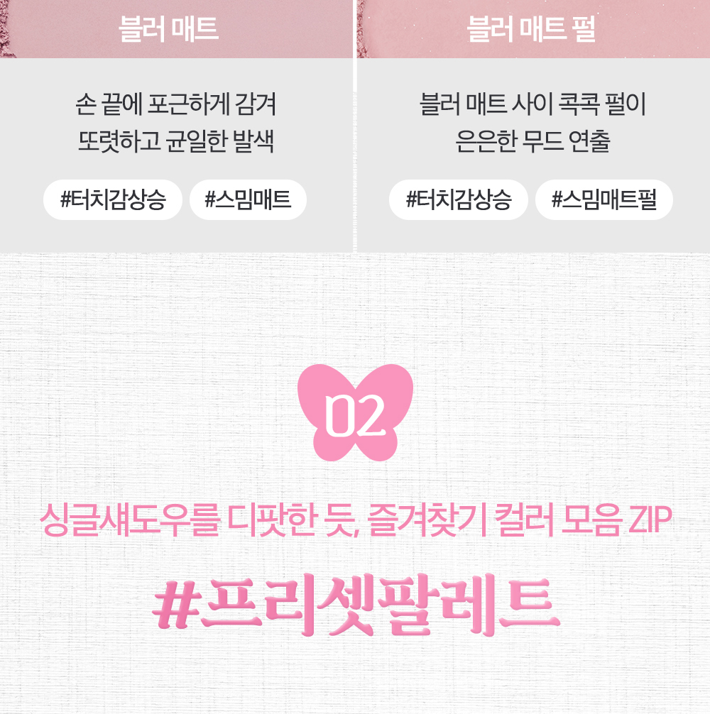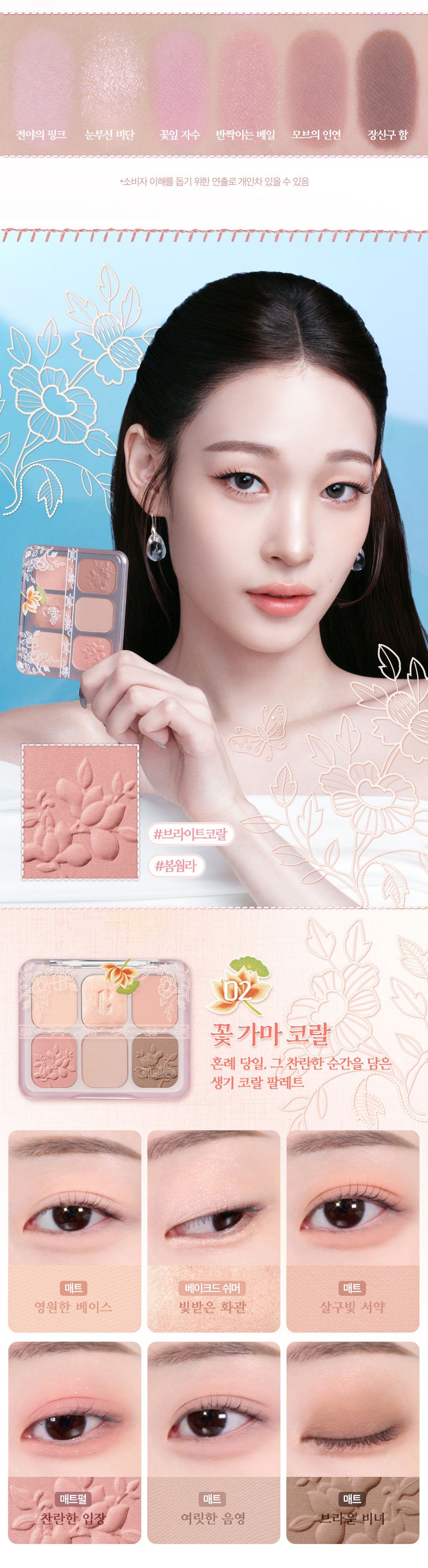 | [01호 수놓은 핑크] 01-1 탤크,마이카 (CI 77019),티타늄디옥사이드 (CI 77891),알루미늄전분옥테닐석시네이트,실리카,바륨설페이트,옥틸도데실스테아로일스테아레이트,페닐트라이메티콘,마그네슘스테아레이트,다이펜타에리스리틸헥사하이드록시스테아레이트/헥사스테아레이트/헥사로지네이트,다이메티콘,마카다미아씨오일,다이아이소스테아릴말레이트,카프릴릴글라이콜,트라이에톡시카프릴릴실레인,C30-45알킬다이메티콘,글리세릴카프릴레이트,카민 (CI 75470),알루미늄하이드록사이드,다이메티콘올스테아레이트,하이드로제네이티드레시틴,에틸헥실글리세린,망가니즈바이올렛 (CI 77742),적색산화철 (CI 77491),메티콘,황색산화철 (CI 77492),울트라마린 (CI 77007),흑색산화철 (CI 77499),마그네슘미리스테이트,말토덱스트린,카올린,토코페롤 01-2 마이카 (CI 77019),다이메티콘,티타늄디옥사이드 (CI 77891),합성플루오르플로고파이트,타피오카전분,알루미나,칼슘알루미늄보로실리케이트,폴리메틸실세스퀴옥세인,글리세린,마그네슘미리스테이트,라우로일라이신,트라이에톡시카프릴릴실레인,울트라마린 (CI 77007),솔비탄스테아레이트,틴옥사이드,카프릴릴글라이콜,에틸헥실글리세린,마그네슘알루미늄실리케이트,소듐아크릴레이트/소듐아크릴로일다이메틸타우레이트코폴리머,글리세릴카프릴레이트,솔비탄올리베이트,비닐다이메티콘/메티콘실세스퀴옥세인크로스폴리머,소듐데하이드로아세테이트,실리카,아이소헥사데칸,적색산화철 (CI 77491),카올린,폴리솔베이트80,솔비탄올리에이트,토코페롤 01-3 탤크,합성플루오르플로고파이트,마이카 (CI 77019),바륨설페이트,실리카,티타늄디옥사이드 (CI 77891),옥틸도데실스테아로일스테아레이트,페닐트라이메티콘,마그네슘스테아레이트,다이메티콘,마카다미아씨오일,다이펜타에리스리틸헥사하이드록시스테아레이트/헥사스테아레이트/헥사로지네이트,트라이에톡시카프릴릴실레인,다이아이소스테아릴말레이트,카민 (CI 75470),카프릴릴글라이콜,글리세릴카프릴레이트,알루미늄다이미리스테이트,에틸헥실글리세린,울트라마린 (CI 77007),적색산화철 (CI 77491),알루미늄하이드록사이드,메티콘,마그네슘미리스테이트,황색4호 (CI 19140),황색산화철 (CI 77492),흑색산화철 (CI 77499),말토덱스트린,토코페롤 01-4 마이카 (CI 77019),탤크,보론나이트라이드,실리카,칼슘알루미늄보로실리케이트,티타늄디옥사이드 (CI 77891),네오펜틸글라이콜다이에틸헥사노에이트,페닐트라이메티콘,다이메티콘,마그네슘스테아레이트,C30-45알킬다이메티콘,다이펜타에리스리틸헥사하이드록시스테아레이트/헥사스테아레이트/헥사로지네이트,다이아이소스테아릴말레이트,아이소스테아릴네오펜타노에이트,옥틸도데실스테아로일스테아레이트,마카다미아씨오일,카프릴릴글라이콜,카민 (CI 75470),황색산화철 (CI 77492),글리세릴카프릴레이트,적색산화철 (CI 77491),폴리부텐,흑색산화철 (CI 77499),망가니즈바이올렛 (CI 77742),에틸헥실글리세린,울트라마린 (CI 77007),하이드로제네이티드레시틴,라우로일라이신,트라이에톡시카프릴릴실레인,알루미늄하이드록사이드,메티콘,카올린,틴옥사이드,말토덱스트린,토코페롤 01-5 탤크,마이카 (CI 77019),망가니즈바이올렛 (CI 77742),보론나이트라이드,실리카,티타늄디옥사이드 (CI 77891),네오펜틸글라이콜다이에틸헥사노에이트,페닐트라이메티콘,다이메티콘,울트라마린 (CI 77007),마그네슘스테아레이트,적색산화철 (CI 77491),다이펜타에리스리틸헥사하이드록시스테아레이트/헥사스테아레이트/헥사로지네이트,다이아이소스테아릴말레이트,아이소스테아릴네오펜타노에이트,옥틸도데실스테아로일스테아레이트,C30-45알킬다이메티콘,마카다미아씨오일,카프릴릴글라이콜,글리세릴카프릴레이트,폴리부텐,카올린,흑색산화철 (CI 77499),에틸헥실글리세린,카민 (CI 75470),하이드로제네이티드레시틴,라우로일라이신,황색산화철 (CI 77492),알루미늄하이드록사이드,메티콘,트라이에톡시카프릴릴실레인,말토덱스트린,토코페롤 01-6 탤크,마이카 (CI 77019),망가니즈바이올렛 (CI 77742),보론나이트라이드,실리카,울트라마린 (CI 77007),티타늄디옥사이드 (CI 77891),흑색산화철 (CI 77499),네오펜틸글라이콜다이에틸헥사노에이트,나일론-12,적색산화철 (CI 77491),황색산화철 (CI 77492),페닐트라이메티콘,다이메티콘,마그네슘스테아레이트,다이펜타에리스리틸헥사하이드록시스테아레이트/헥사스테아레이트/헥사로지네이트,다이아이소스테아릴말레이트,아이소스테아릴네오펜타노에이트,옥틸도데실스테아로일스테아레이트,C30-45알킬다이메티콘,카프릴릴글라이콜,마카다미아씨오일,카민 (CI 75470),폴리부텐,카올린,글리세릴카프릴레이트,에틸헥실글리세린,라우로일라이신,하이드로제네이티드레시틴,알루미늄하이드록사이드,메티콘,트라이에톡시카프릴릴실레인,말토덱스트린,토코페롤 [02호 꽃가마코랄] 02-1 탤크,마이카 (CI 77019),티타늄디옥사이드 (CI 77891),실리카,합성플루오르플로고파이트,보론나이트라이드,나일론-12,옥틸도데실스테아로일스테아레이트,페닐트라이메티콘,마그네슘스테아레이트,마카다미아씨오일,다이메티콘,