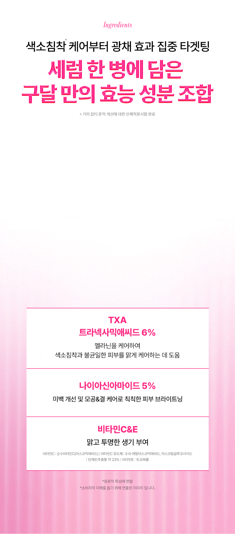 | 정제수,탄제린추출물,부틸렌글라이콜,글리세레스-26,트라넥사믹애씨드,나이아신아마이드,프로판다이올,다이프로필렌글라이콜,1,2-헥산다이올,토코페릴아세테이트,펜틸렌글라이콜,3-O-에틸아스코빅애씨드,다이에톡시에틸석시네이트,아이리쉬모스추출물,판테놀,사탕수수추출물,글리세린,카보머,암모늄아크릴로일다이메틸타우레이트/브이피코폴리머,트로메타민,잔탄검,에틸헥실글리세린,해바라기씨오일,아데노신,아스코빌글루코사이드,소듐하이알루로네이트,소듐파이테이트,페룰릭애씨드,사이아노코발아민,베타-글루칸,베르가모트오일,아스코빅애씨드,알칸나뿌리추출물,소듐아스코빌포스페이트,레몬껍질오일,녹차씨오일,라벤더오일,오렌지껍질오일,유칼립투스잎추출물,일랑일랑꽃오일,토코페롤,글루코노락톤,효모발효추출물,칸디다 봄비콜라/글루코오스/메틸레이프씨데이트발효물,폴리글리세릴-10올리에이트,니코틴아마이드모노뉴클레오타이드,니코틴아마이드아데닌다이뉴클레오타이드,아데노신트라이포스페이트,폴리글리세릴-10라우레이트,포스파티딜콜린,하이드로제네이티드레시틴,칼슘판토테네이트,노나펩타이드-1 |