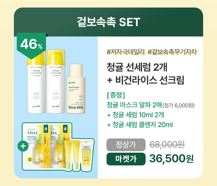| 선세럼 : 정제수, 에탄올, 페네틸벤조에이트, 디에칠아미노하이드록시벤조일헥실벤조에이트, 비스-에칠헥실옥시페놀메톡시페닐트리아진, 탄제린추출물, 다이부틸아디페이트, 에칠헥실트리아존, 나이아신아마이드, 실리카, 프로필헵틸카프릴레이트, 메틸프로판다이올, 알부틴, 카프릴릴메티콘, 폴리메틸실세스퀴옥세인, 자일리톨, 베르가모트오일, 백미꽃추출물, 라벤더오일, 레몬껍질오일, 일랑일랑꽃오일, 오렌지껍질오일, 유칼립투스잎추출물, 접시꽃추출물, 헥실라우레이트, 이소아밀p-메톡시신나메이트, 폴리실리콘-15, 펜틸렌글라이콜, 1,2-헥산다이올, 다이부틸라우로일글루타마이드, C18-21알케인, 하이드록시에틸우레아, 다이부틸에틸헥사노일글루타마이드, 암모늄아크릴로일다이메틸타우레이트/브이피코폴리머, 소듐아크릴레이트크로스폴리머-2, 소듐폴리아크릴로일다이메틸타우레이트, 부틸렌글라이콜, C30-45알킬다이메틸실릴폴리프로필실세스퀴옥세인, 하이드록시아세토페논, 알란토인, 다이포타슘글리시리제이트, 트로메타민, 아스코빌글루코사이드, 에틸헥실글리세린, 토코페롤, 다이소듐이디티에이, 리모넨, 리날룰 밀크 선크림 : 정제수, 징크옥사이드, 사이클로헥사실록세인, 메틸트라이메티콘, 부틸옥틸살리실레이트, 프로판다이올, 프로필렌글라이콜다이카프릴레이트, 부틸렌글라이콜다이카프릴레이트/다이카프레이트, 카프릴릴메티콘, 폴리글리세릴-5폴리리시놀리에이트, 메틸메타크릴레이트크로스폴리머, 쌀추출물, 다이스테아다이모늄헥토라이트, 폴리글리세릴-3폴리다이메틸실록시에틸다이메티콘, 바실러스/소이빈발효추출물, 소듐하이알루로네이트, 쌀겨오일, 하이드로제네이티드레시틴, 마그네슘설페이트, 트라이에톡시카프릴릴실레인, 1,2-헥산다이올, 락토바실러스/소이밀크발효여과물, 락토바실러스/호밀가루발효물, 글리세릴카프릴레이트, 카프릴릴글라이콜, 에틸헥실글리세린, 토코페롤, 글리세린, 세라마이드엔피, 피토스핑고신 |
