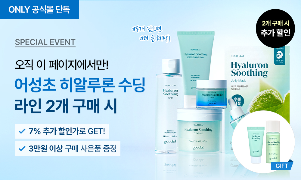 | 앰플기획 정제수, 다이프로필렌글라이콜, 1,2-헥산다이올, 부틸렌글라이콜, 어성초추출물(=약모밀추출물, 8,201ppm), 자일리톨, 소듐하이알루로네이트(1,260ppm), 편백오일, 유칼립투스잎오일, 하이드롤라이즈드하이알루로닉애씨드(0.15ppm), 하이알루로닉애씨드(0.1ppm), 칸디다 봄비콜라/글루코오스/메틸레이프씨데이트발효물, 포도씨오일, 병풀잎추출물, 산구절초추출물, 해바라기씨오일, 쇠비름추출물, 베타인, 다이에톡시에틸석시네이트, 하이드록시에틸셀룰로오스, 에리스리톨, 솔비톨, 하이드록시에틸우레아, 판테놀, C12-14알케스-12, 글리세린, 암모늄아크릴로일다이메틸타우레이트/브이피코폴리머, 에틸헥실글리세린, 카프릴릭/카프릭트라이글리세라이드, 알란토인, 다이포타슘글리시리제이트, 하이드로제네이티드레시틴, 셀룰로오스, 폴리글루타믹애씨드, 세라마이드엔피, 하이알루로닉애씨드/폴리아이소프로필아크릴아마이드코폴리머(1ppm), 토코페롤, 다이메틸실란올하이알루로네이트(0.15ppm), 하이드롤라이즈드소듐하이알루로네이트(0.15ppm), 포타슘하이알루로네이트(0.1ppm), 하이드록시프로필트라이모늄하이알루로네이트(0.08ppm), 소듐하이알루로네이트크로스폴리머(0.08ppm), 프로판다이올, 소듐하이알루로네이트다이메틸실란올(0.05ppm), 소듐아세틸레이티드하이알루로네이트(0.04ppm), 폴리글리세릴-10아이소스테아레이트, 폴리글리세릴-10올리에이트, 엑토인, 스테아릭애씨드, 글리세릴카프릴레이트, 세라마이드엔에스, 콜레스테롤, 피토스핑고신, 세라마이드에이피, 세라마이드에이에스, 세라마이드이오피, 세테아릴알코올 크림기획 정제수, 글리세린, 비닐다이메티콘, 부틸렌글라이콜, 카프릴릴메티콘, 다이프로필렌글라이콜, 1,2-헥산다이올, 펜틸렌글라이콜, 에리스리톨, 자일리톨, 어성초추출물(=약모밀추출물, 6,501ppm), 효모발효여과물, 소듐하이알루로네이트(102.1ppm), 편백오일, 유칼립투스잎오일, 하이드롤라이즈드하이알루로닉애씨드(0.15ppm), 하이알루로닉애씨드(0.1ppm), 칸디다 봄비콜라/글루코오스/메틸레이프씨데이트발효물, 포도씨오일, 병풀잎추출물, 산구절초추출물, 해바라기씨오일, 쇠비름추출물, 에틸헥실팔미테이트, 암모늄아크릴로일다이메틸타우레이트/브이피코폴리머, 솔비톨, 트로메타민, 아크릴레이트/C10-30알킬아크릴레이트크로스폴리머, 카프릴릭/카프릭트라이글리세라이드, 에틸헥실글리세린, 판테놀, 하이드로제네이티드레시틴, 소듐파이테이트, 세라마이드엔피, 베타-글루칸, 다발방패버섯추출물, 엑토인, 셀룰로오스, 폴리글루타믹애씨드, 하이알루로닉애씨드/폴리아이소프로필아크릴아마이드코폴리머(1ppm), 글리세릴카프릴레이트, 다이메틸실란올하이알루로네이트(0.15ppm), 하이드롤라이즈드소듐하이알루로네이트(0.15ppm), 포타슘하이알루로네이트(0.1ppm), 토코페롤, 하이드록시프로필트라이모늄하이알루로네이트(0.08ppm), 소듐하이알루로네이트크로스폴리머(0.08ppm), 프로판다이올, 소듐하이알루로네이트다이메틸실란올(0.05ppm), 소듐아세틸레이티드하이알루로네이트(0.04ppm), 폴리글리세릴-10아이소스테아레이트, 폴리글리세릴-10올리에이트, 스테아릭애씨드, 세라마이드엔에스, 콜레스테롤, 피토스핑고신, 세라마이드에이피, 세라마이드에이에스, 세라마이드이오피, 카보머, 세테아릴알코올 토너기획 정제수, 글리세린, 부틸렌글라이콜, 메틸글루세스-20, 펜틸렌글라이콜, 메틸프로판다이올, 어성초추출물(=약모밀추출물, 511.1ppm), 소듐하이알루로네이트(501.01ppm), 편백오일, 유칼립투스잎오일, 칸디다 봄비콜라/글루코오스/메틸레이프씨데이트발효물, 포도씨오일, 병풀잎추출물, 산구절초추출물, 하이드롤라이즈드하이알루로닉애씨드(0.015ppm), 하이알루로닉애씨드(0.01ppm), 해바라기씨오일, 쇠비름추출물, 1,2-헥산다이올, 판테놀, 옥틸도데세스-16, 글루코노락톤, 에틸헥실글리세린, 에리스리톨, 솔비톨, 소듐파이테이트, 알란토인, 폴리쿼터늄-51, 엑토인, 석시닉애씨드, 토코페롤, 하이알루로닉애씨드/폴리아이소프로필아크릴아마이드코폴리머(0.1ppm), 다이메틸실란올하이알루로네이트(0.015ppm), 하이드롤라이즈드소듐하이알루로네이트(0.015ppm), 포타슘하이알루로네이트(0.01ppm), 하이드록시프로필트라이모늄하이알루로네이트(0.008ppm), 소듐하이알루로네이트크로스폴리머(0.008ppm), 프로판다이올, 소듐하이알루로네이트다이메틸실란올(0.005ppm), 소듐아세틸레이티드하이알루로네이트(0.004ppm), 글리세릴카프릴레이트, 폴리글리세릴-10아이소스테아레이트, 폴리글리세릴-10올리에이트, 하이드로제네이티드레시틴, 스테아릭애씨드, 세라마이드엔피, 세라마이드엔에스, 콜레스테롤, 피토스핑고신, 세라마이드에이피, 세라마이드에이에스, 세라마이드이오피, 세테아릴알코올 패드기획 정제수, 프로판다이올, 부틸렌글라이콜, 메틸프로판다이올, 어성초추출물(=약모밀추출물, 201ppm), 소듐하이알루로네이트(100ppm), 편백오일, 유칼립투스잎오일, 효모발효여과물, 백미꽃추출물, 접시꽃추출물, 하이드롤라이즈드하이알루로닉애씨드(0.15ppm), 하이알루로닉애씨드(0.1ppm), 칸디다 봄비콜라/글루