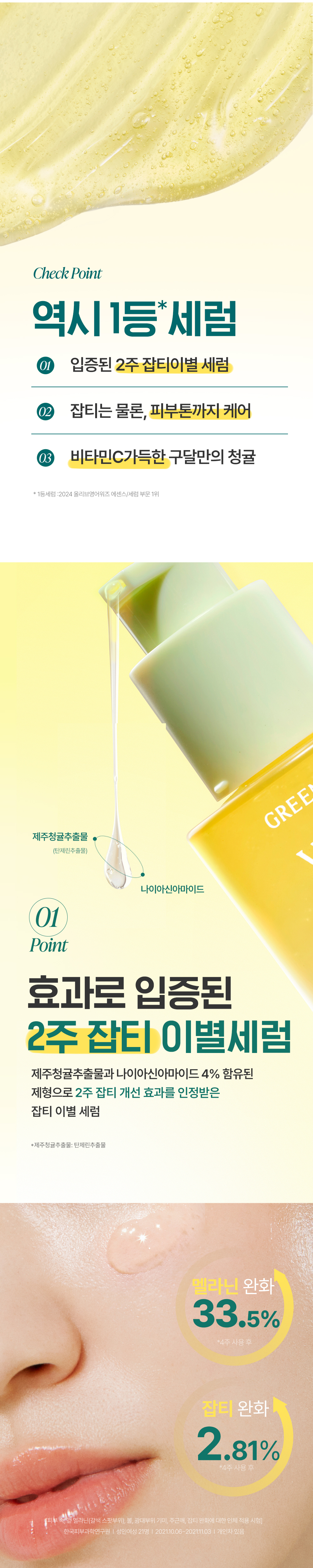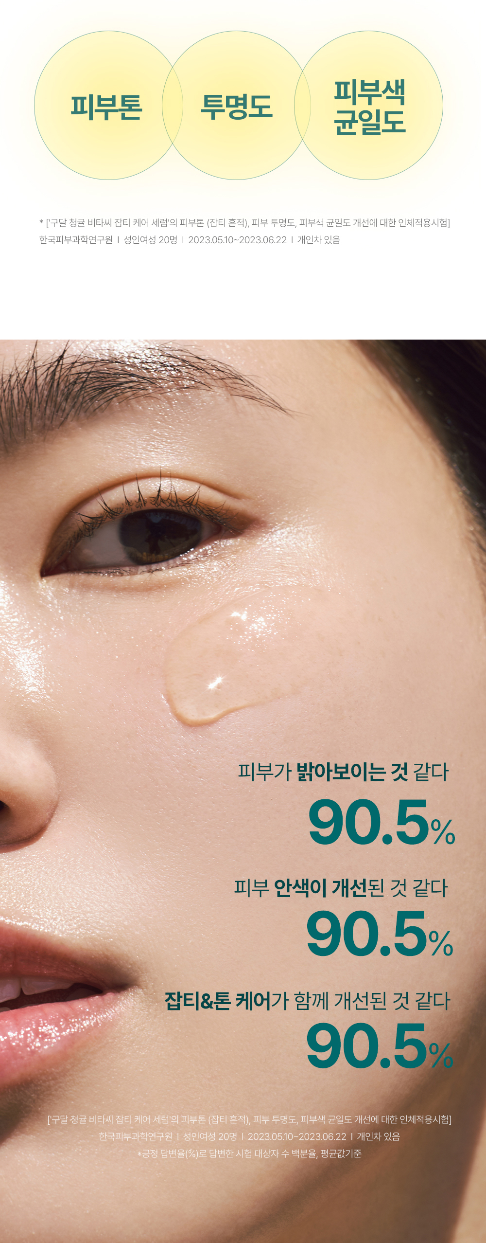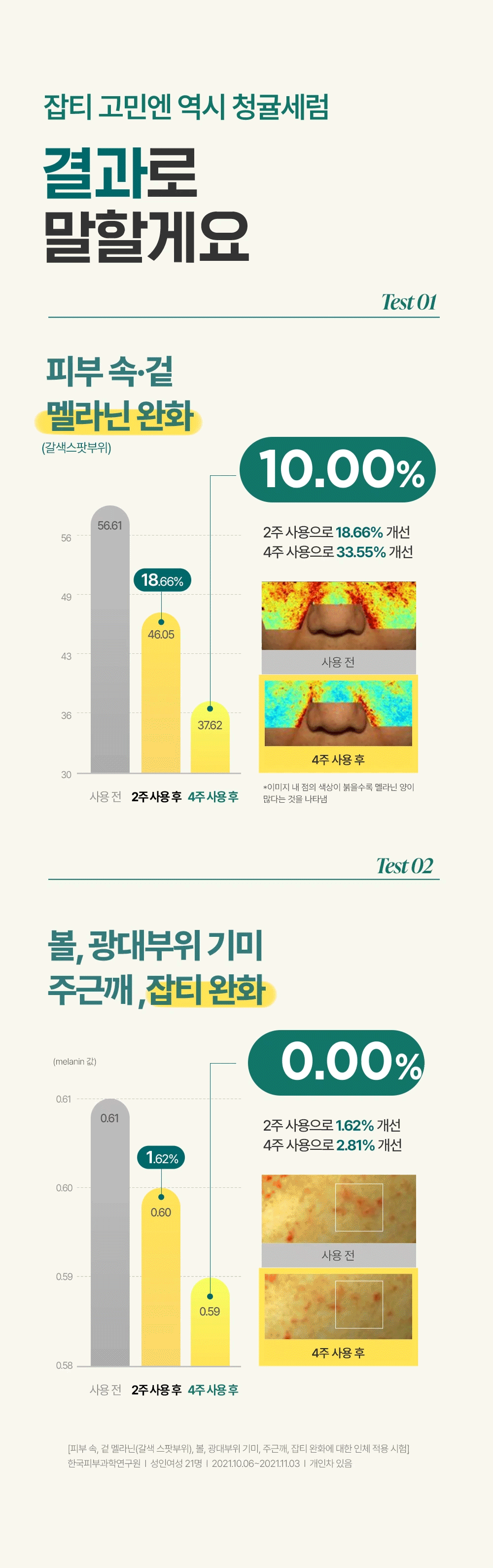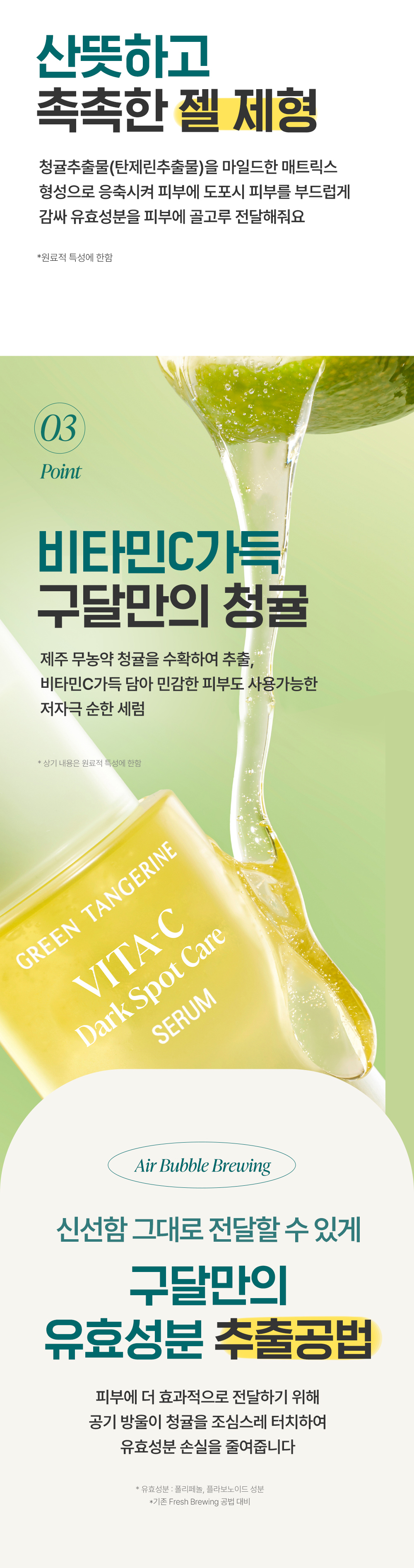 | 탄제린추출물, 부틸렌글라이콜, 나이아신아마이드, 다이프로필렌글라이콜, 메틸글루세스-20, 정제수, 1,2-헥산다이올, 글리세레스-26, 알부틴, 아이리쉬모스추출물, 사탕수수추출물, 하이드롤라이즈드호호바에스터, 소듐하이알루로네이트, 베르가모트오일, 인도멀구슬나무꽃추출물, 홀리바질잎추출물, 인도멀구슬나무잎추출물, 울금뿌리추출물, 참산호말추출물, 라벤더오일, 레몬껍질오일, 일랑일랑꽃오일, 오렌지껍질오일, 유칼립투스잎추출물, 감초뿌리추출물, 캐모마일꽃추출물, 녹차추출물, 병풀추출물, 로즈마리잎추출물, 호장근뿌리추출물, 병풀잎추출물, 암모늄아크릴로일다이메틸타우레이트/브이피코폴리머, 판테놀, 콜레스-24, 트로메타민, 에틸헥실글리세린, 알란토인, 토코페릴아세테이트, 아데노신, 소듐파이테이트, 아스코빌글루코사이드(100ppm), 다이포타슘글리시리제이트, 글리세린, 마데카소사이드, 말토덱스트린, 사카라이드하이드롤리세이트, 토코페롤, 아시아티코사이드, 카보머, 잔탄검, 리모넨, 리날룰 |